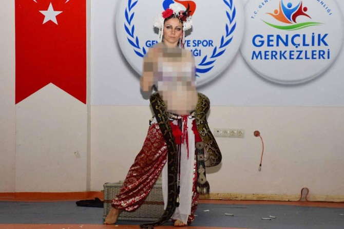 Şanlıurfa'nın Hilvan ilçesinde hafta sonu ilkokul öğrencilerine yönelik düzenlenen etkinlik kapsamında, bir kadının uygunsuz kıyafetle yaptığı piton gösterisine ailelerden tepki yağdı.
