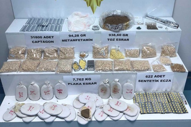 NARKOTİM ekipleri tarafından Seyhan ilçesinde bulunan Meydan Mahallesi'nde bir adrese yapılan operasyonda, 7 kilo 762 gram plaka esrar, 31 bin 800 adet captagon hap, 938,60 gram esrar, 622 adet sentetik ecza, 94,28 gram metamfetamin ve bir adet hassas terazi ele geçirildi.