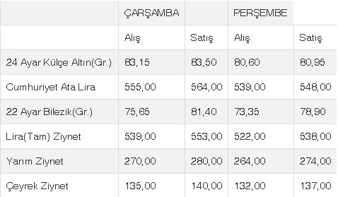 İstanbul Kapalıçarşı'da alınıp satılan altın türlerinin, önceki ve bugün itibariyle kapanış fiyatları (TL) şöyle: