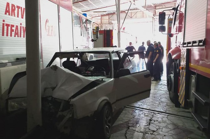 Artvin'de direksiyon hâkimiyetini kaybeden sürücü, otomobiliyle itfaiyenin içerisine girdi