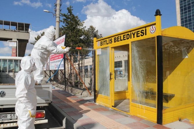 Bitlis Belediyesi ekipleri Covid-19'a karşı otobüs durakları dezenfekte etti