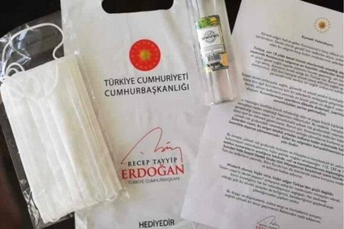 Cumhurbaşkanı Recep Tayyip Erdoğan’ın kaleme aldığı bir mektup, 65 yaş ve üstü vatandaşlara ücretsiz olarak dağıtılan maske ve kolonya paketlerinde yer aldı.