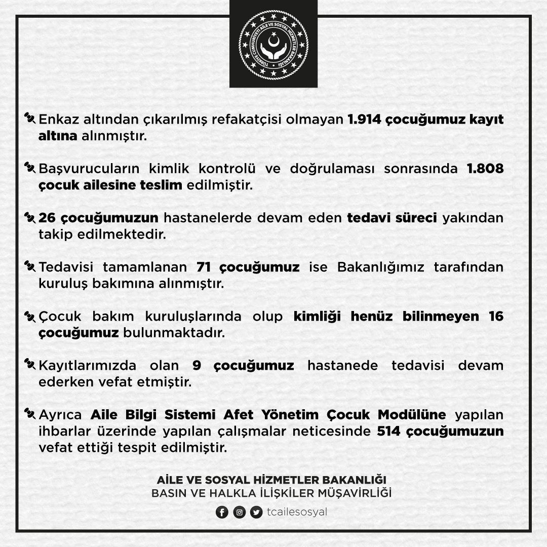 Kayıtlarımızda olan 9 çocuğumuz hastanede tedavisi devam ederken vefat etmiştir. Ayrıca Aile Bilgi Sistemi Afet Yönetim Çocuk Modülü'ne yapılan ihbarlar üzerinde yapılan çalışmalar neticesinde 514 çocuğumuzun vefat ettiği tespit edilmiştir."