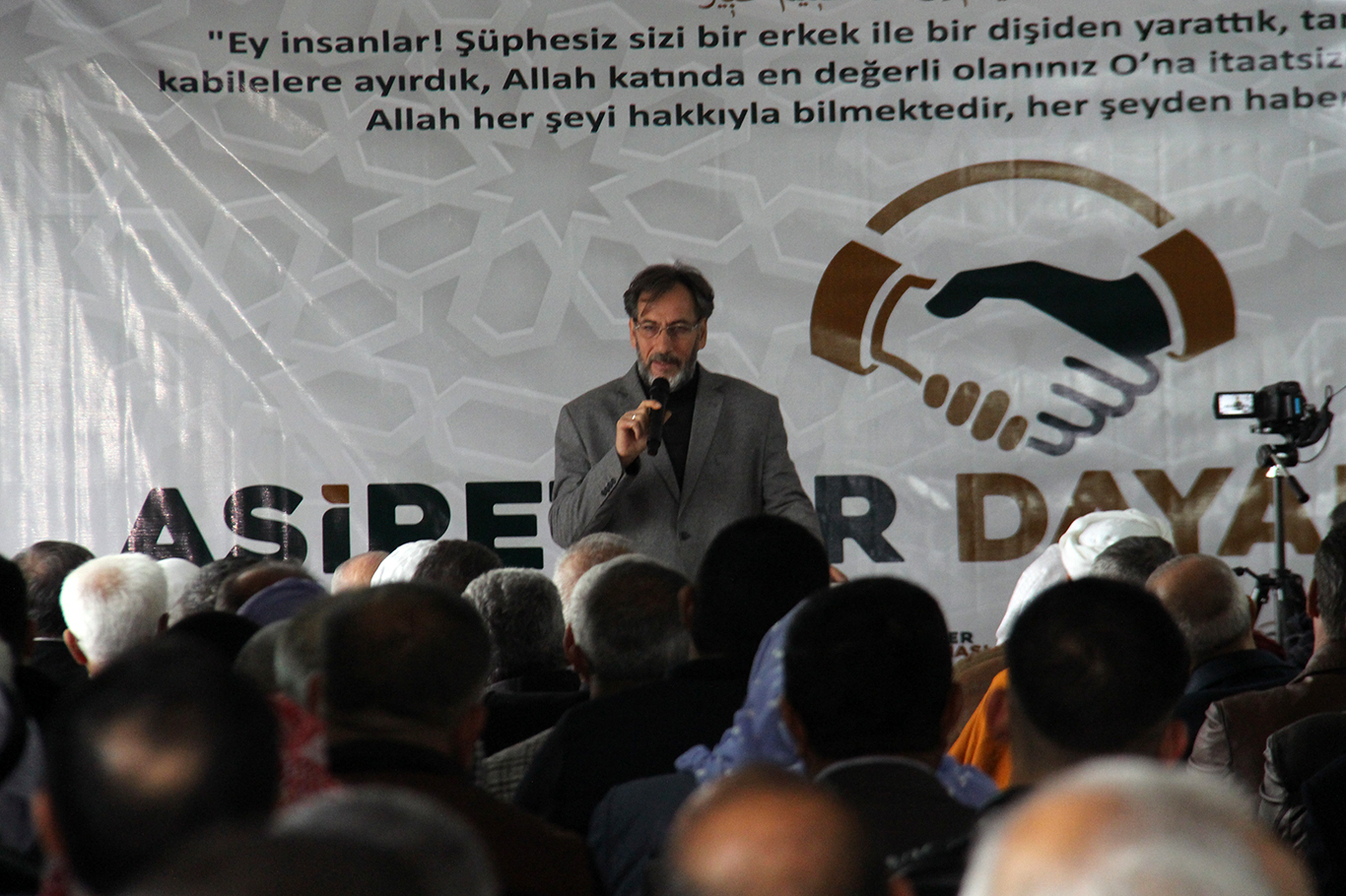 "Şunu belirtmek isterim ki sizler burada misafir değil, ev sahiplerisiniz." İfadeleriyle sözlerine başlayan Önal, "Nitekim bu külliye halkımızın ve milletimizin istifade edebilmesi için inşa edildi ki işte bugünde sizleri ağırlıyor. Evvelde aşiretler, alimler, kanaat önderleri, aile büyükleri adaletle birbirlerine yaklaşmış, memleketin sorun sıkıntılarını gündemine almış, barışa vesile olmuş, yaşamlarını beraber idame etmişlerdir. Fakat 100 yıldır global dedikleri büyük küfür, kirli ellerini bu yapıların içerisine sokmuş; şeyhlerimizi, alimlerimizi, aile büyüklerimizi itibarsızlaştırmak istemiş ve nispeten muvaffak olmuşlardır. İşte bizler bu tür buluşma ve programlarla şeyh, alim, kanaat önderleri ve aile büyüklerinin itibarlarının yeniden tesis edinmesinin sağlanmasını istiyoruz. Nitekim Peygamber Efendimizin hayatına baktığımızda, Efendimiz Medine'ye geldiğinde yaptığı ilk icraatlerden biri sahabeler arasında kardeşliği tesis etmek, Medine'ye yapılabilecek herhangi bir saldırıya karşı yek vücut olabilmek adına gayri müslimler ittifak kurmak olmuştur." dedi.
