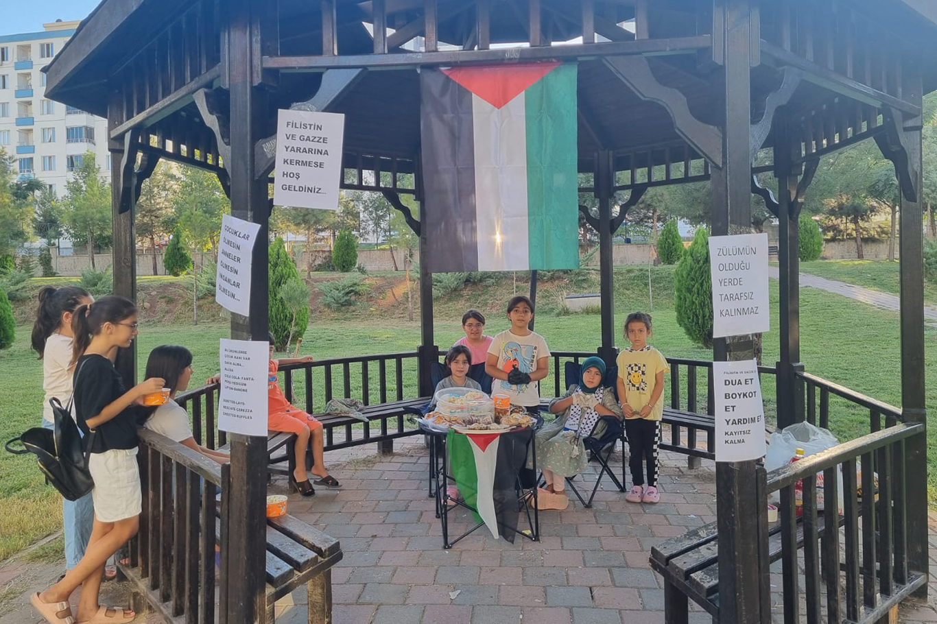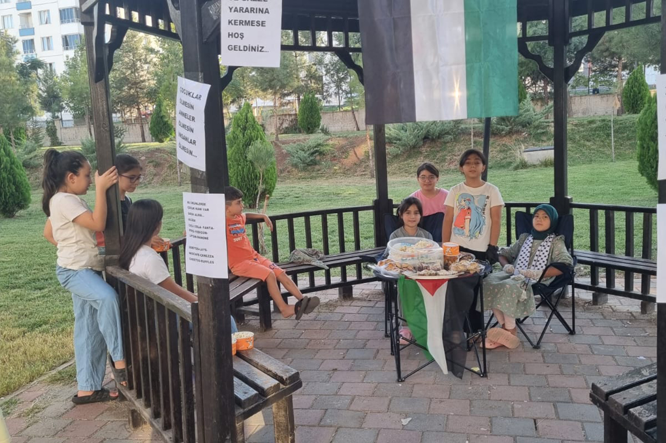 Diyarbakır'ın Kayapınar ilçesinde bir sitede yaşayan çocuklar, örnek bir dayanışma sergileyerek kendi imkânlarıyla kermes düzenledi. Satıştan elde ettikleri geliri Gazze'deki ihtiyaç sahiplerine ulaştırılmak üzere Umut Kervanı Diyarbakır Derneği'ne teslim eden çocuklar, çevredekilerin takdirini topladı.