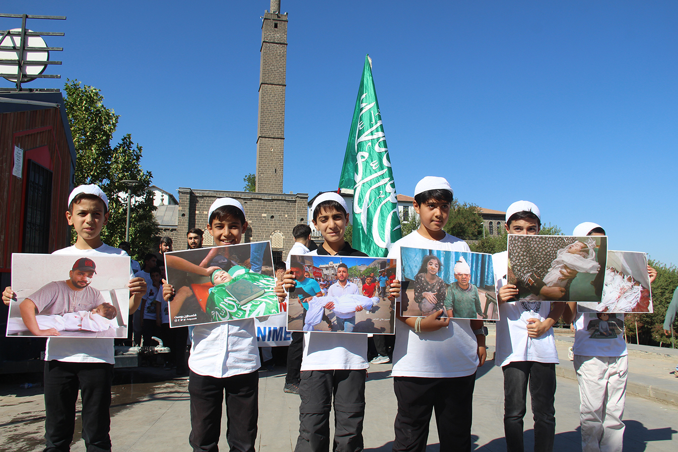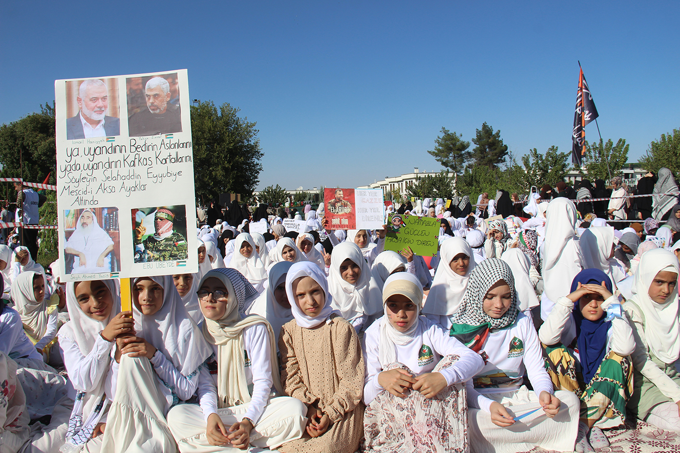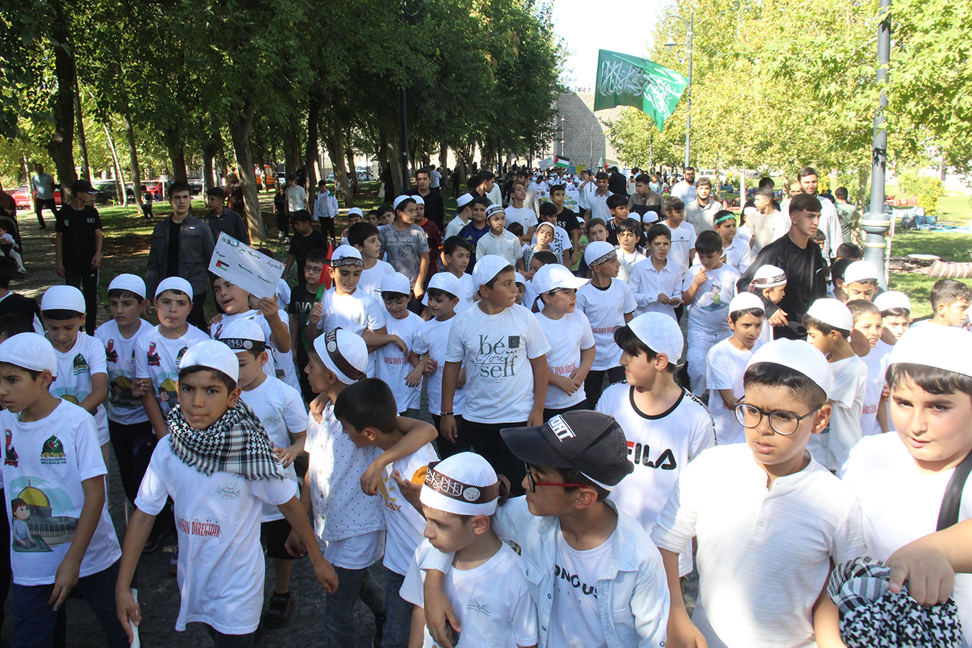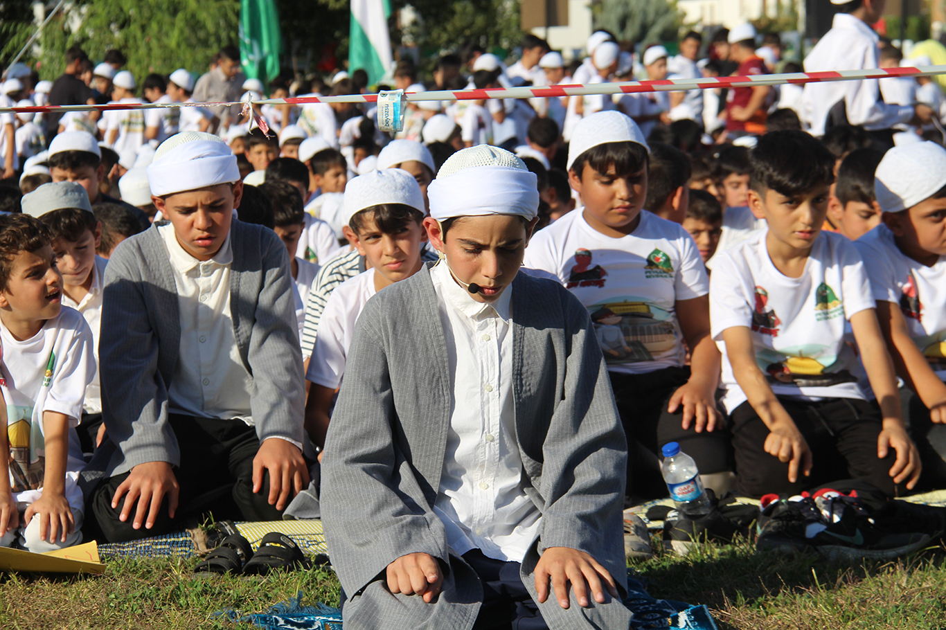Namaz eğitimlerinin taçlandırıldığı bu günde Gazzeli akranlarını unutmayan miniklerin büyük kahramanı Ebu Ubeyde'nin posteri ile Gazze'deki ablukayı kırmak için yola çıkan küresel Sumud Filosu'na destek mesajı veren afişlerini balonlarla havalandırması görenleri duygulandı.