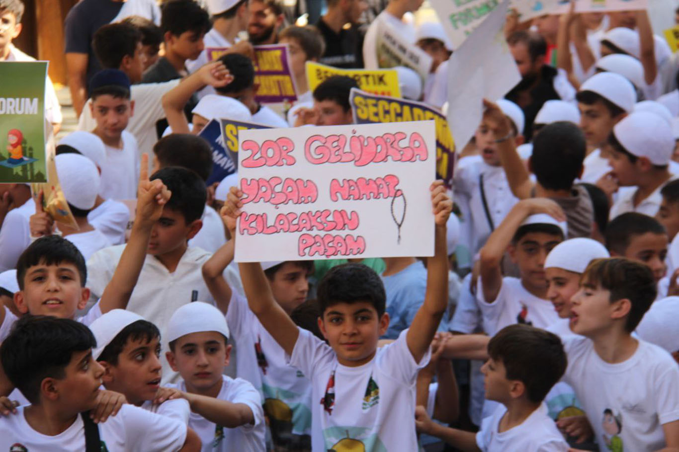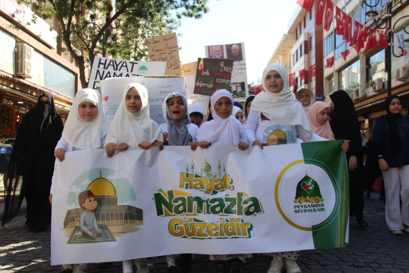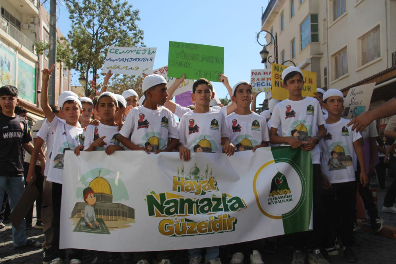 Çocuklar, daha sonra Kurşunlu Cami yerleşkesinde düzenlenecek “Hayat Namazla Güzeldir” etkinliğine katılmak üzere Gazi Caddesi’nde sloganlar eşliğinde yürüdü.