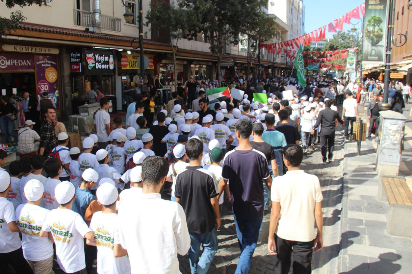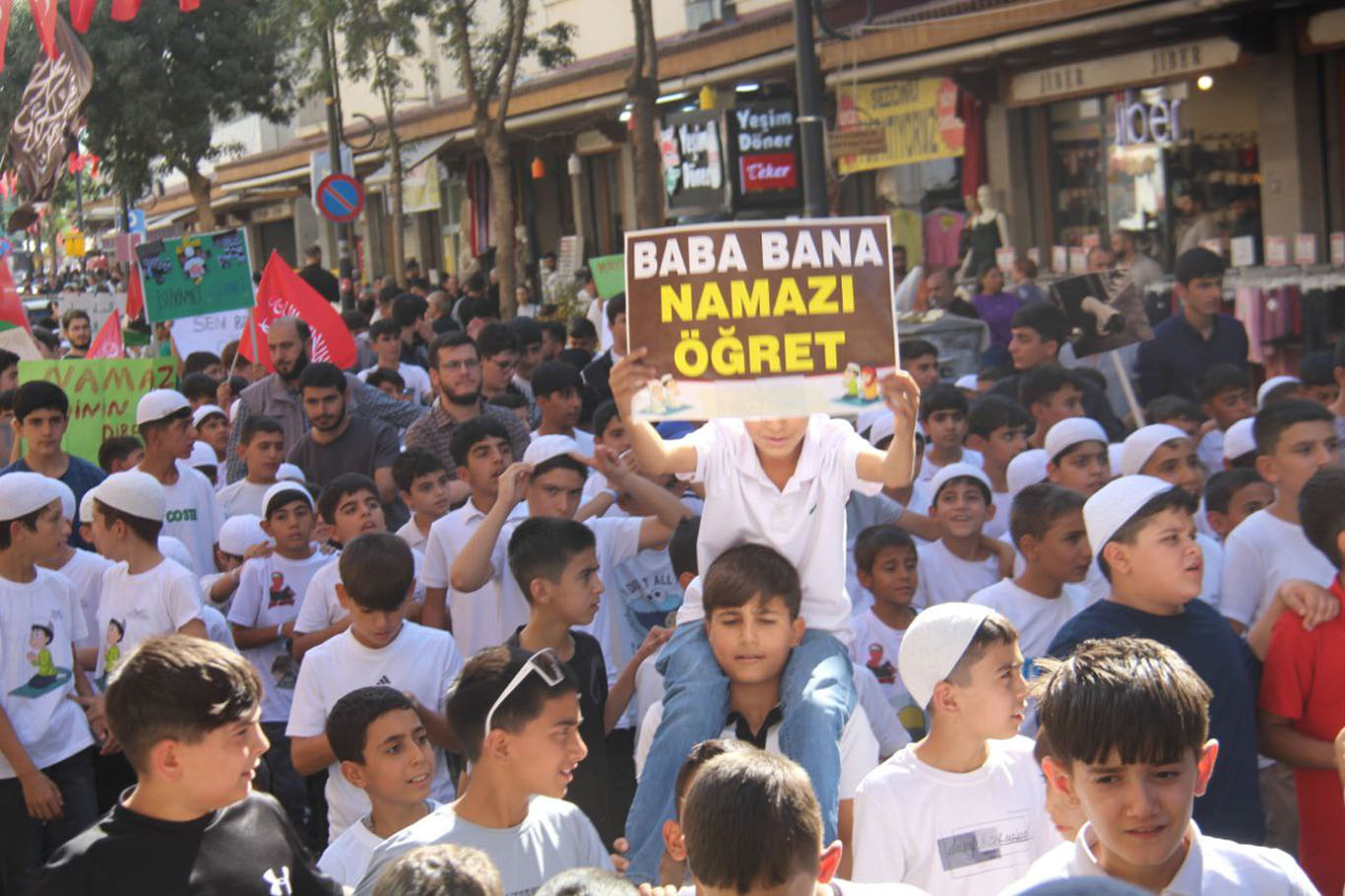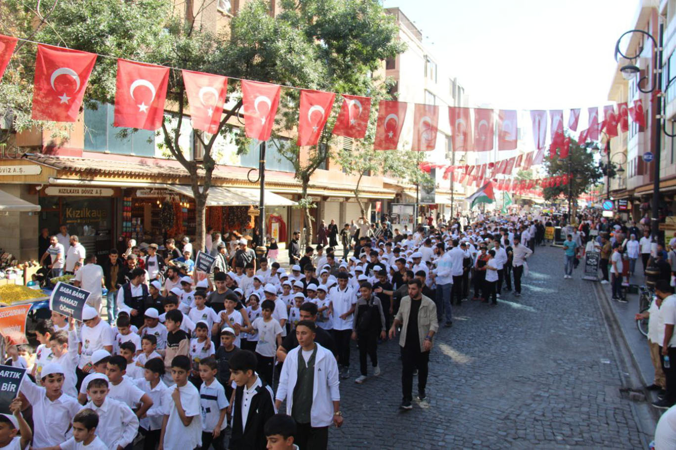 Çocuklar, daha sonra Kurşunlu Cami yerleşkesinde düzenlenecek “Hayat Namazla Güzeldir” etkinliğine katılmak üzere Gazi Caddesi’nde sloganlar eşliğinde yürüdü.