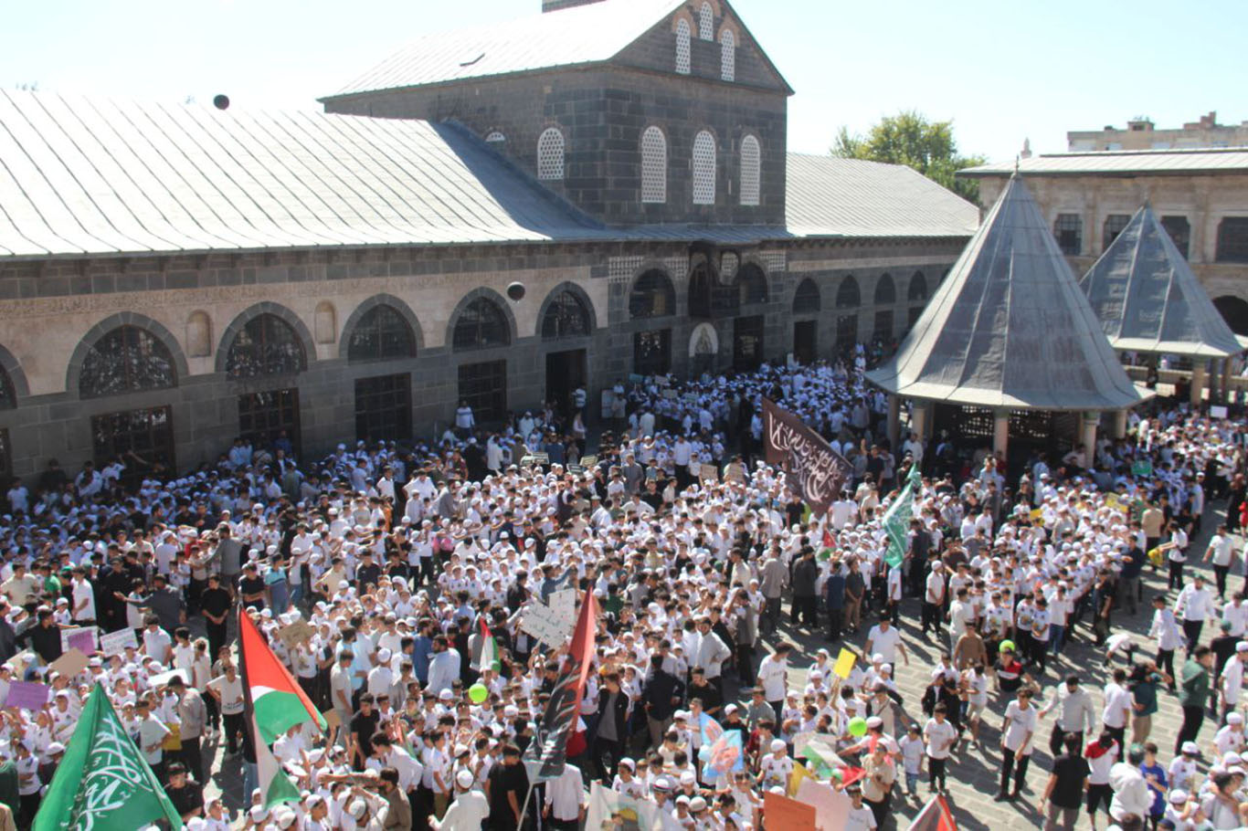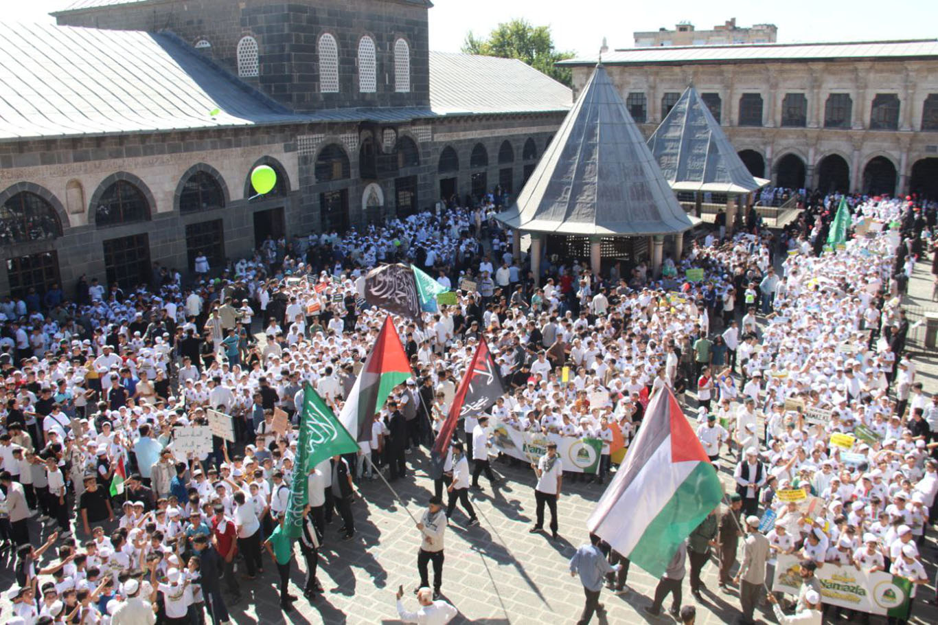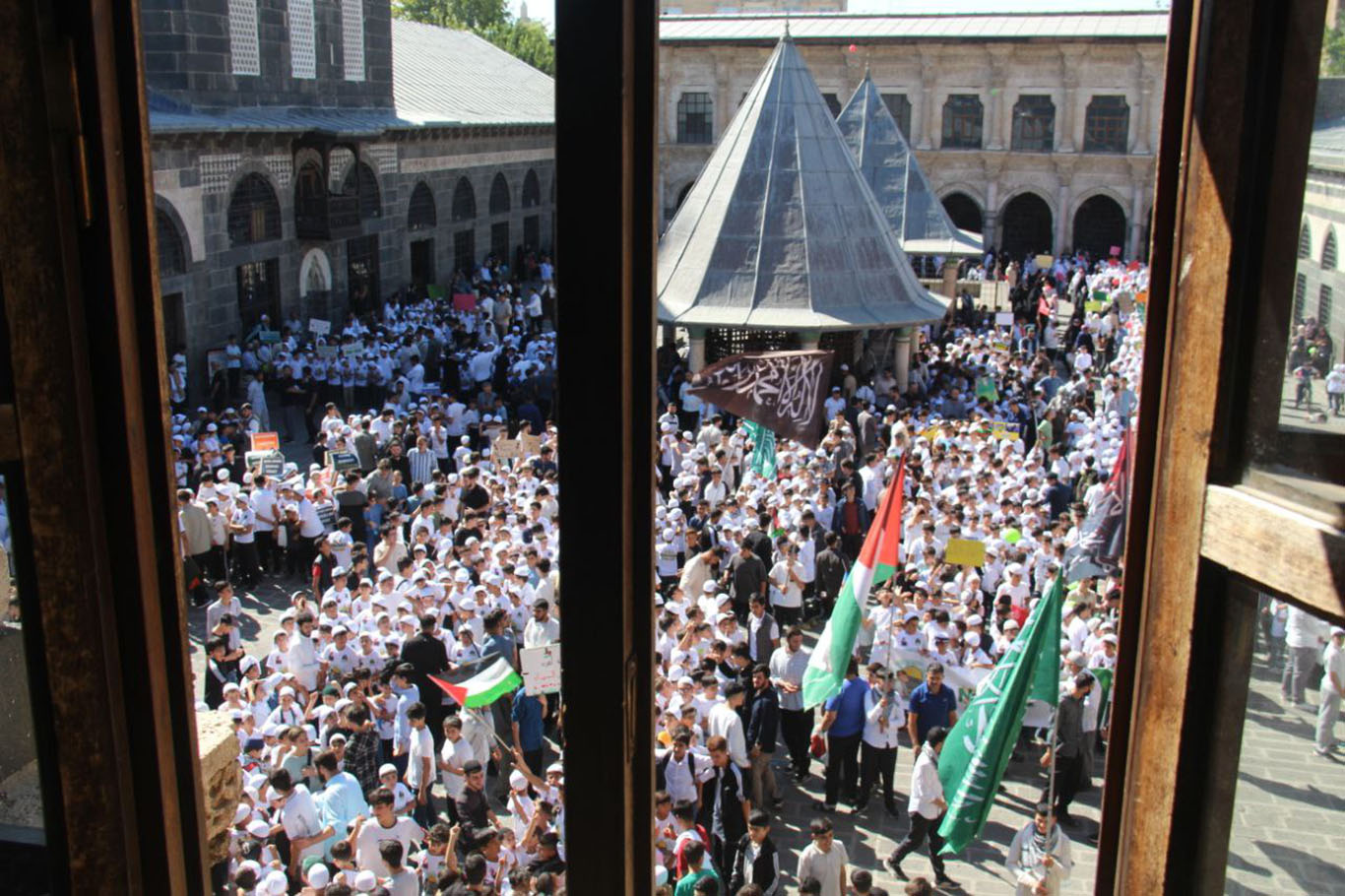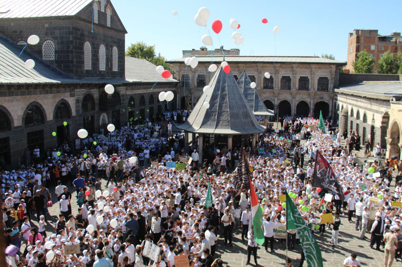 Diyarbakır’da, Gazze’deki ablukayı kırmak için yola çıkan Küresel Sumud Filosu’na destek amacıyla yüzlerce çocuk Ulu Cami’de bir araya geldi.