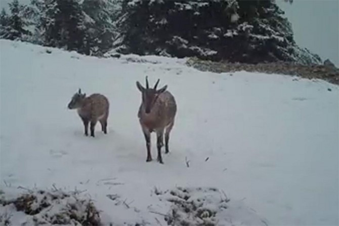 Adıyaman Doğa Koruma ve Milli Parklar Genel Müdürlüğü tarafından yaban hayvanlarını izlemek için doğaya yerleştirilen foto kapana takılan dağ keçileri bırakılan yemleri yerken görüntülendi.