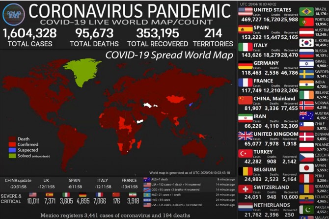 Dünyanın kâbusu haline gelen Coronavirus (Covid-19) salgınında dünya geneli vaka sayısı 1 milyon 600 bin 328’e, ölü sayısı ise 95 bin 673'e ulaştı.