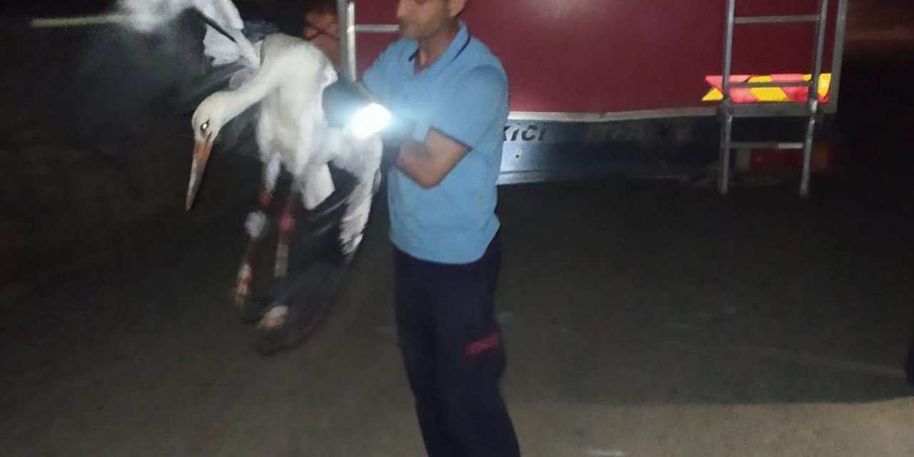 Elektrik tellerine takılı leylek itfaiye tarafından kurtarıldı