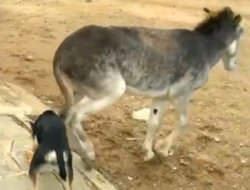 Videoda bir köpek eşekle yemeğini paylaşmayınca eşek intikam olarak köpeğe çifte atıyor.