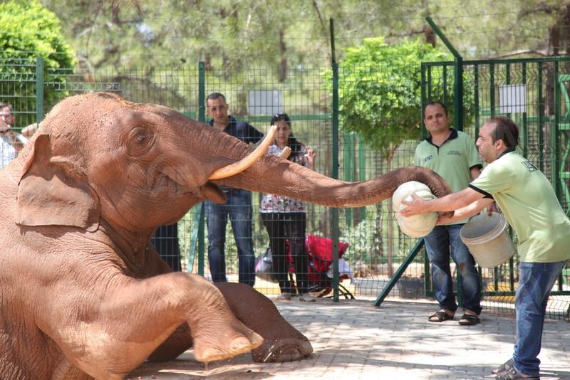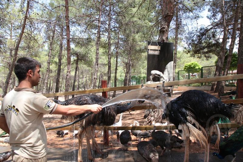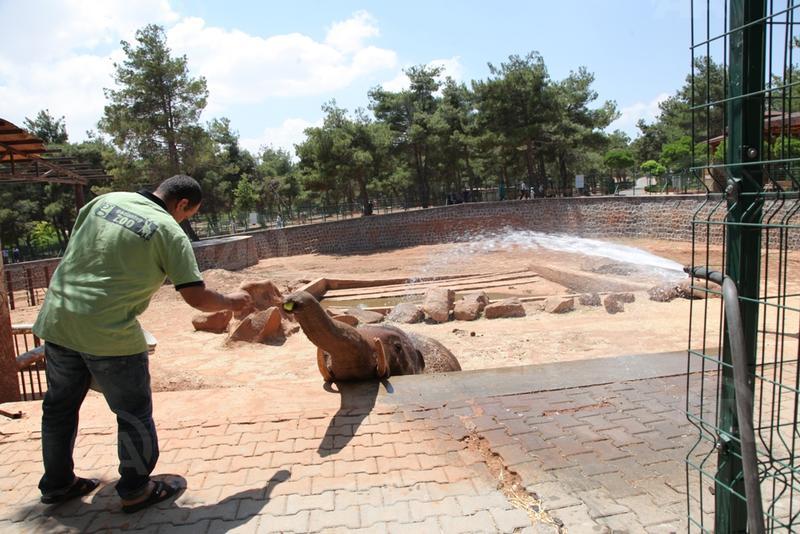 Gaziantep Hayvanat Bahçesi'ndeki hayvanlar, 40 dereceyi bulan yaz sıcaklarında özel olarak hazırlanan buzlu kokteylerle serinletiliyor. Hayvanat bahçesindeki fil ise sulanarak serinletiliyor.