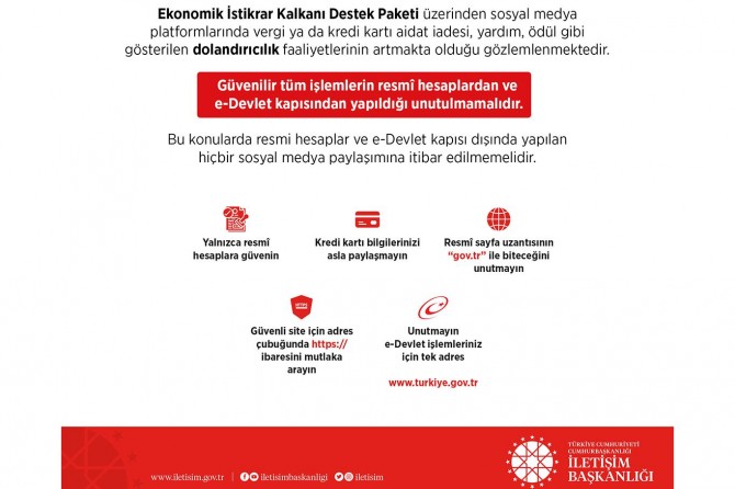 İletişim Başkanlığından yapılan açıklamada, Ekonomik İstikrar Kalkanı Destek Paketi üzerinden sosyal medya platformlarında vergi ya da kredi kartı aidat iadesi, yardım, ödül gibi gösterilen dolandırıcılık faaliyetlerinin artmakta olduğunun gözlemlendiği belirtildi.