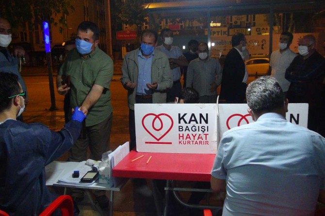 Kızılay tarafından şehrin merkezinde kurulan çadırda kan bağışında bulunmak isteyen HÜDA PAR İl Başkanı Mustafa Yetiş ve parti üyeleri teravih namazından sonra kan bağışlamak için form doldurdu.