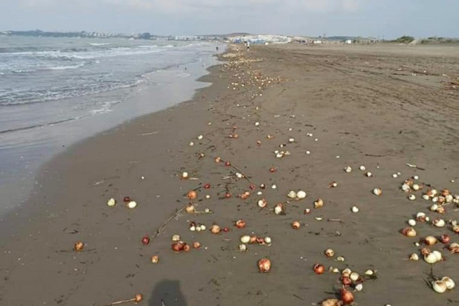 Adana Karataş'ta yüzlerce kilo soğan sahile vurdu