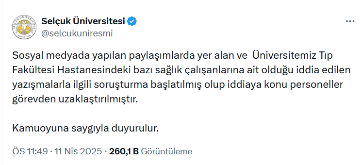 Selçuk Üniversitesi’nden yapılan açıklamada, "Sosyal medyada yer alan yazışmalarla ilgili soruşturma başlatılmış olup, iddiaya konu personeller görevden uzaklaştırılmıştır." denildi.