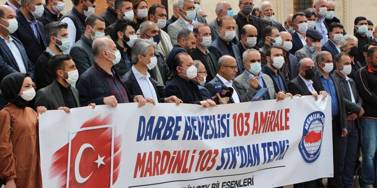 Mardin’de faaliyet yürüten 103 STK, ortak basın açıklaması yaparak 103 emekli amiralin "darbe" imalı bildirisine tepki gösterdi. Merkez Artuklu ilçesi Şakir Nuhoğlu Camii önünde bir araya gelen STK temsilcileri, “Darbe heveslisi 103 amirale Mardinli 103 STK’dan tepki” yazılı afiş açtı.