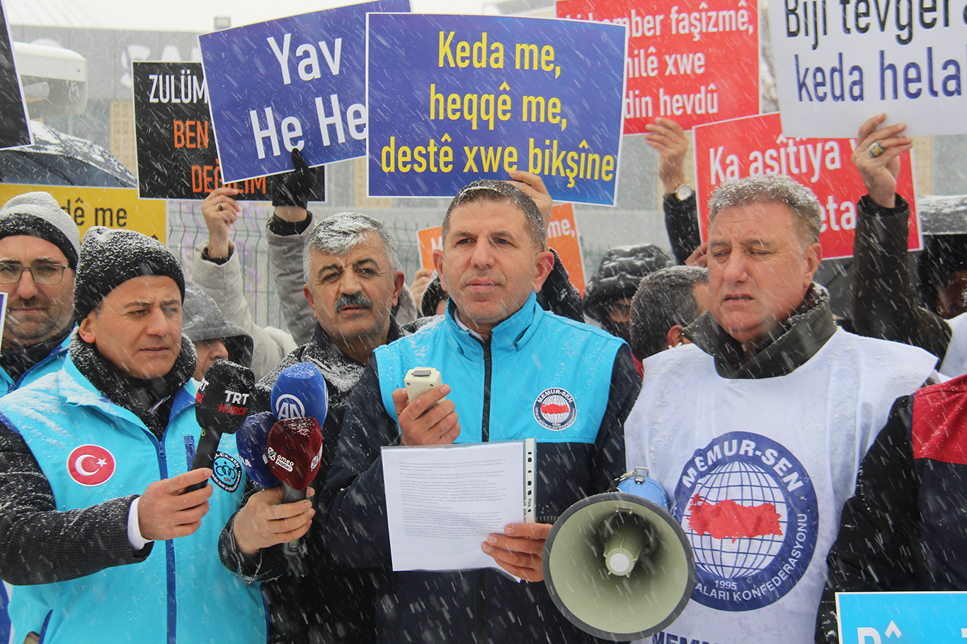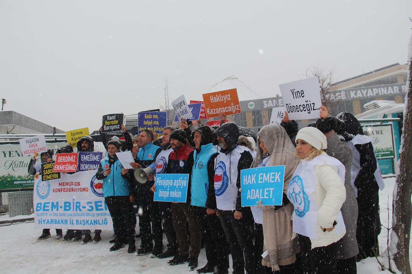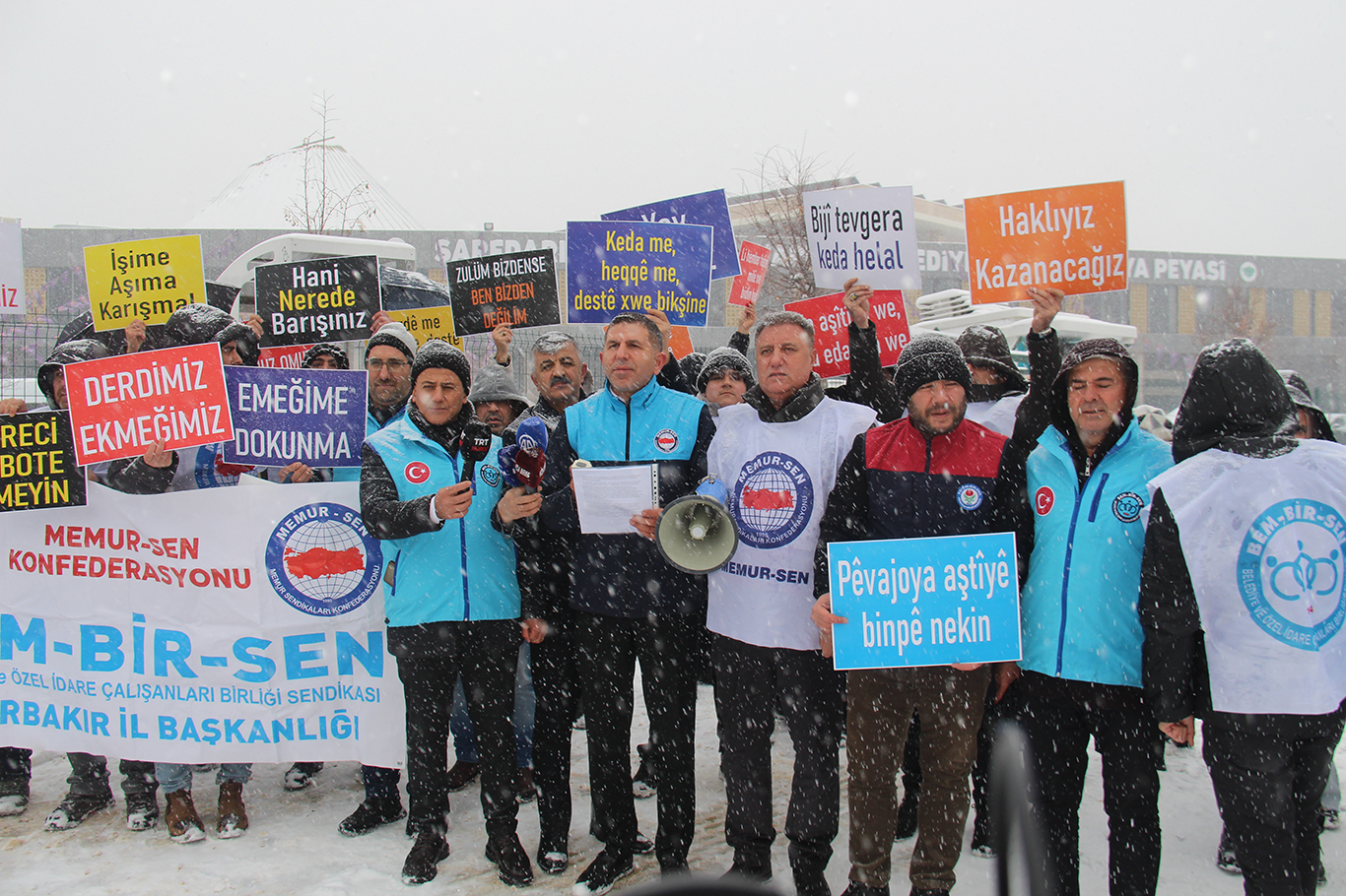Kayapınar Belediyesinin 262 sözleşmeli personeli hukuksuz şekilde işten çıkarmasına sert tepki gösteren Memur-Sen Diyarbakır Şubesi, yoğun kar yağışı altında basın açıklaması düzenledi.