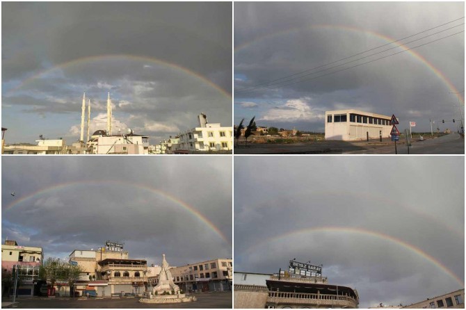 Güneşli havada yağan yağmur çifte gökkuşağı manzaraları oluşturdu
