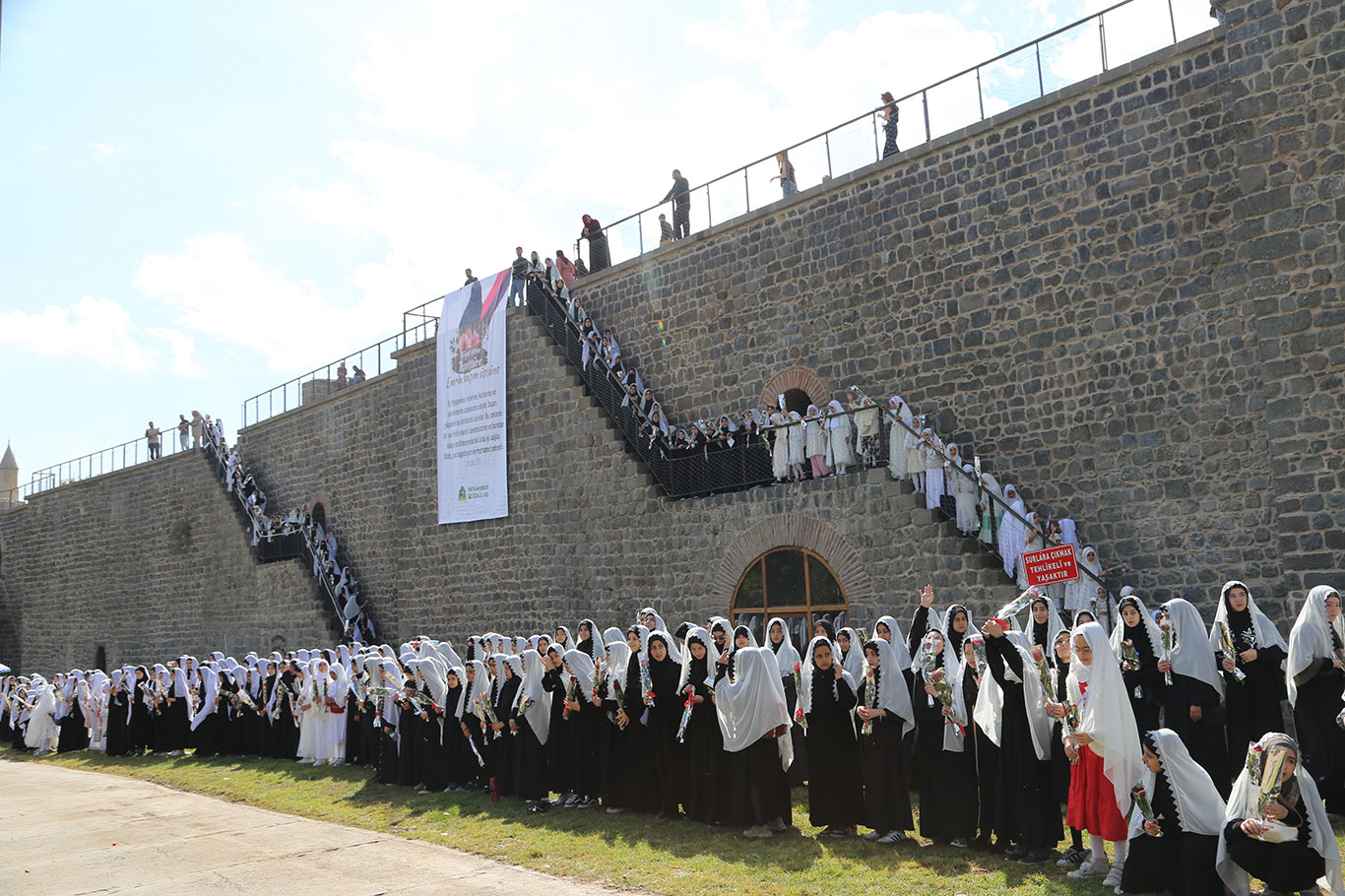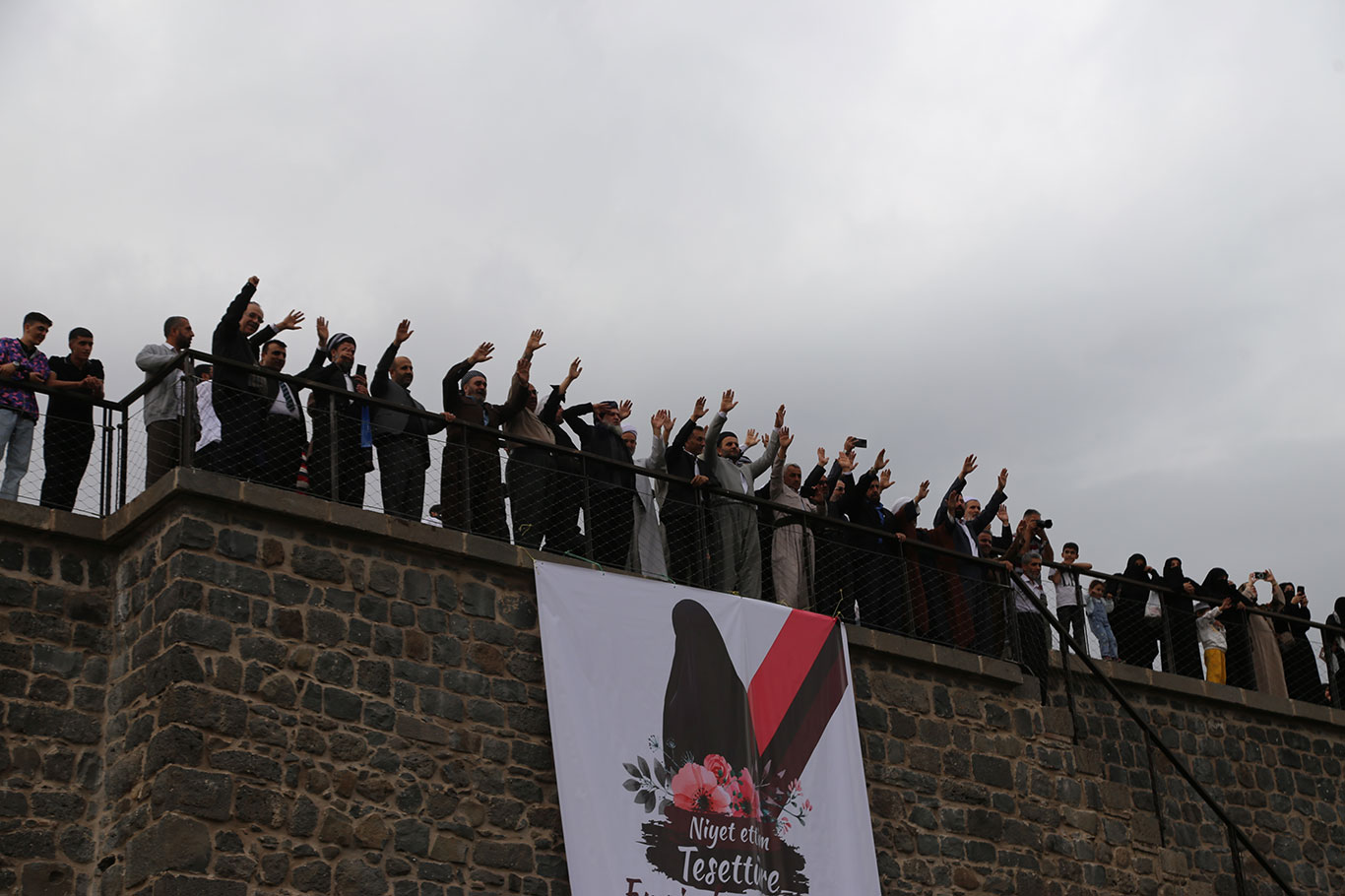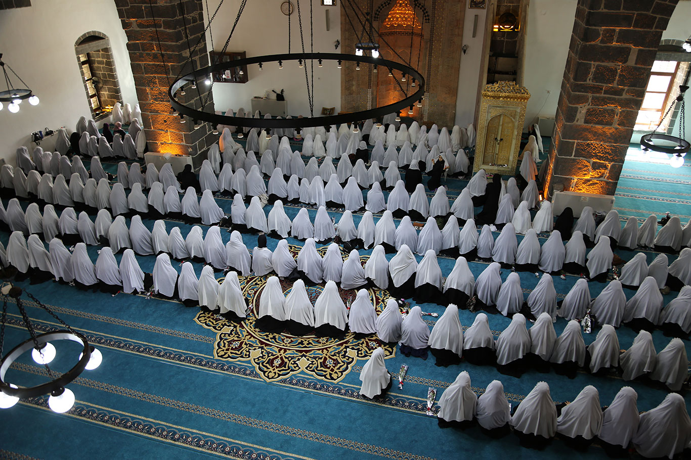 Diyarbakır merkez Sur ilçesi Kurşunlu Camii'nde namaz kılan katılımcılar, ardından Hazreti Süleyman Camii Yerleşkesi'ne doğru yürüyerek burada kendileri için hazırlanan alanda yerlerini aldı.