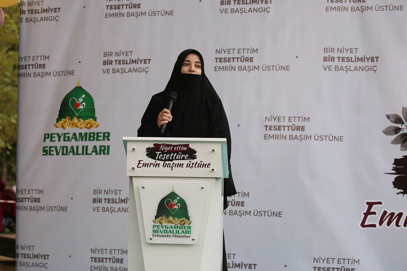 Tesettüre bürünen kız çocukları ve gençlerin ailelerinin de yoğun katılım ve teveccüh gösterdiği program, Kur'an-ı Kerim tilavetiyle başladı, ardından Şeyma Kaplan'ın selamlama konuşmasıyla devam etti.