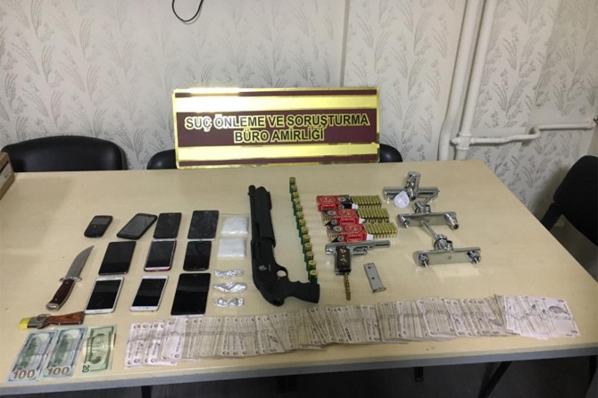 Şehitkamil ilçesinin Boyno Mahallesi'nde bir eve düzenlenen operasyonda ise polisi fark ederek kaçan S.K. isimli şüpheli kovalamaca sonucu yakalanarak gözaltına alındığı, şüphelinin üst ve evinde yapılan aramada ise bir tabanca, 161 dolu fişek, 9 çalıntı cep telefonu, 2 bıçak, bir adet av tüfeği, uyuşturucu satışından elde edildiği değerlendirilen bin 320 TL ve 200 dolar ele geçirildiği belirtildi.