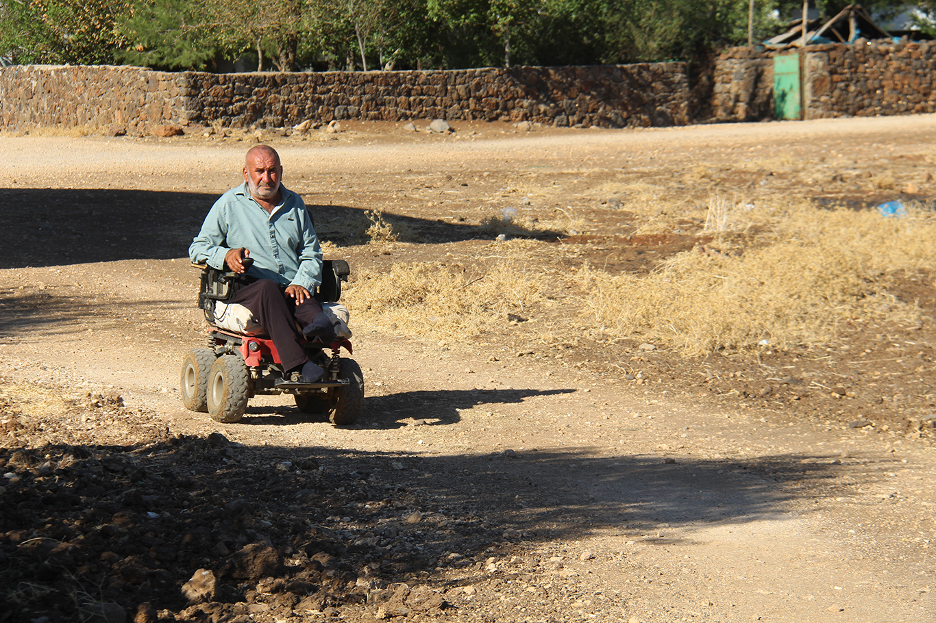 "Yüzde 97 engelliyim, tekerlekli sandalye üzerindeyim. Sandalyemde amasör olmadığından bu yollarda gidip gelirken içim dışıma çıkıyor. Evden camiye, camiden eve giderken veya aileler arası yaptığımız ziyaretlerde sıkıntı yaşıyorum. Özellikle biz engelliler açısından mahalleni yolları oldukça sıkıntılı. Şehir merkezinden mahallenin girişine kadar yol asfalt, mahalle içi ise belediyenin yola döktüğü beyaz çakıl taşlarıdır. Haliyle çakıl taşlı yolda engebelidir."