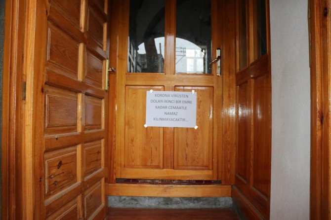 Hasan Çelebi Camii’nin kapısına, “Corona virüsten dolayı ikinci bir emre kadar cemaatle namaz kılınmayacaktır.” yazısı asıldı. Namazların ardından cami imam hatipleri tarafından, Diyanet İşleri Başkanlığının aldığı karar vatandaşlara hatırlatıldı.