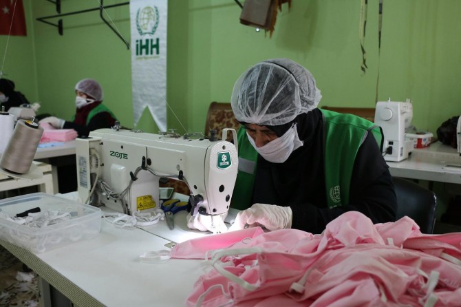 Şanlıurfa İHH İnsani Yardım Vakfı Eyyübiye Mesleki Eğitim Merkezinde, Suriyeli kursiyerlerin destekleriyle ihtiyaç sahipleri için günde bin adet maske üretiliyor.