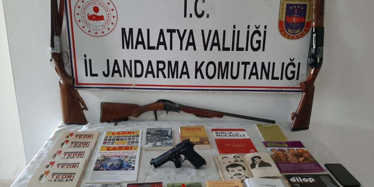 Malatya'nın Akçadağ ilçesinde, sosyal medya üzerinden DHKP/C propagandası yapan 2 kişi yakalanırken, adreslerinde yapılan aramalarda örgütsel dokümanla birlikte silah ele geçirildi.
