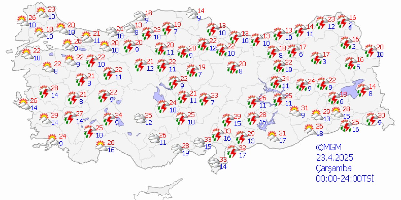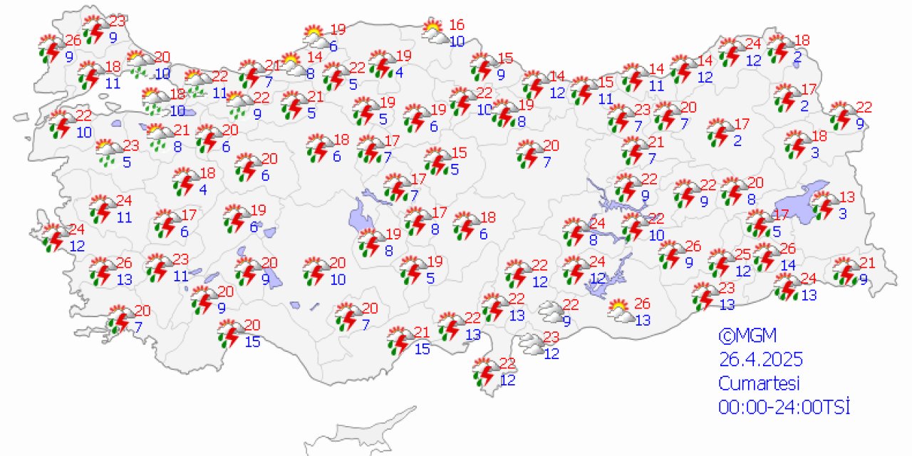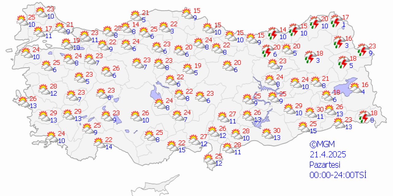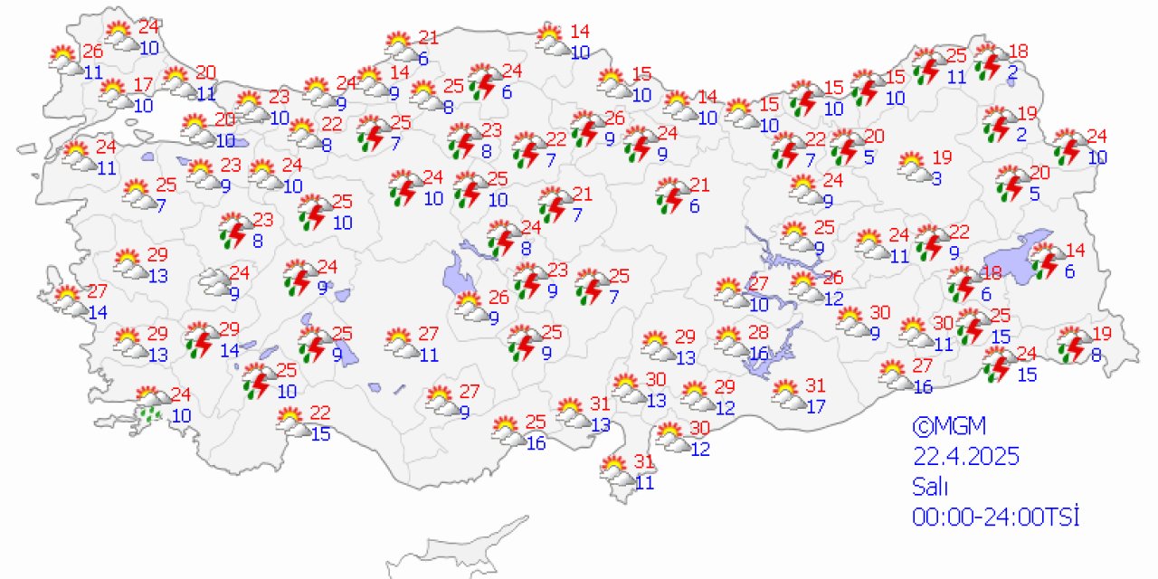 Meteoroloji Genel Müdürlüğü tarafından yapılan tahminlere göre: Ülkemizin doğu kesimlerinin çok bulutlu, Doğu Karadeniz kıyıları, Doğu Anadolu'nun güneybatısı ve Güneydoğu Anadolu'nun doğusu ile Ordu, Tokat, Şırnak ve Iğdır çevrelerinin yağmurlu, İç Anadolu’nun doğusu, Doğu Karadeniz'in iç kesimleri ile Doğu Anadolu'nun kuzey ve doğusunun karla karışık yağmur ve kar yağışlı, diğer yerlerin parçalı ve az bulutlu geçeceği tahmin ediliyor. Yağışların; sabah saatlerinde Hakkari ve Şırnak çevrelerinde yerel kuvvetli olması bekleniyor. Sabah ve gece saatlerinde iç ve doğu kesimlerde buzlanma ve don olayı bekleniyor. Doğu Karadeniz’in iç kesimlerinin yüksekleri ile Doğu Anadolu’nun yüksek ve eğimli alanlarında çığ tehlikesi bulunmaktadır.