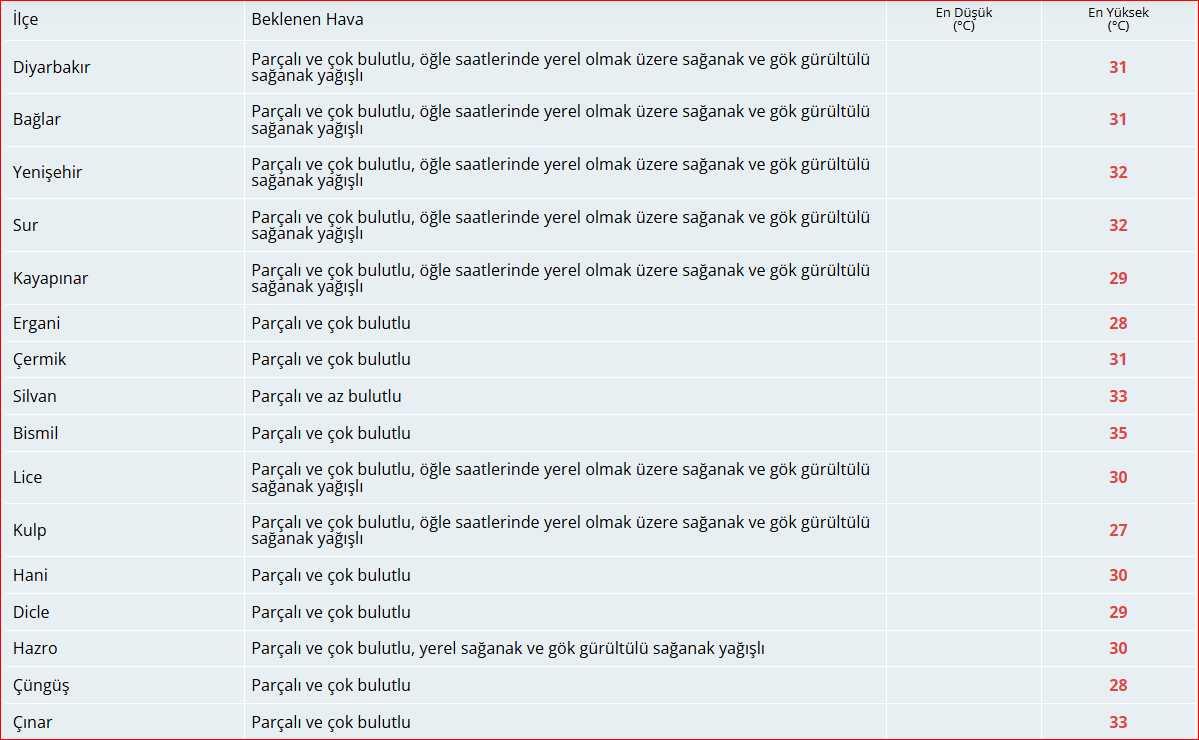 Meteoroloji Genel Müdürlüğü tarafından yapılan tahminlere göre: Ülkemiz genelinin parçalı ve çok bulutlu, Doğu Akdeniz’in Toroslar mevkii, İç Anadolu (Konya'nın güneyi ve Karaman hariç), Karadeniz, Doğu Anadolu, Güneydoğu Anadolu’nun doğusu ile Bilecik, Sakarya, Bursa'nın doğusu, Kütahya, Uşak, Afyonkarahisar, Adana ve Isparta çevrelerinin yerel olmak üzere aralıklı sağanak ve gök gürültülü sağanak yağışlı geçeceği tahmin ediliyor. Yağışların, Orta ve Doğu Karadeniz ile Erzurum'un kuzeyi, Kars ve Ardahan çevrelerinde yer yer kuvvetli olması bekleniyor. Güneydoğu Anadolu’da toz taşınımı görüleceği tahmin ediliyor.