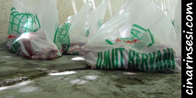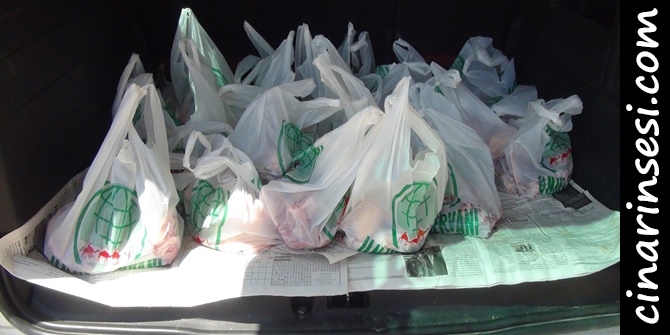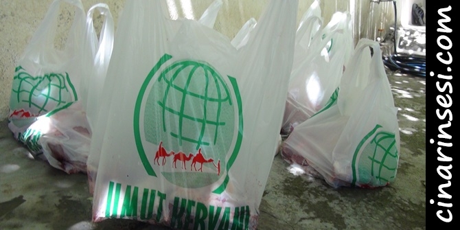 Yardım poşetlerine doldurulan etler fakir ailelere dağıtılmak üzere arabalara yerleştirildi.