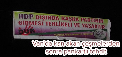 Van'da tepkilere neden olan çeşmelerden kan akan billboard afişlerinden sonra Erciş'te mahalle sakinleri adına asılan "HDP dışında başka partinin girmesi tehlikeli ve yasaktır" yazılı pankartla bir kez daha halk tehdit edildi.